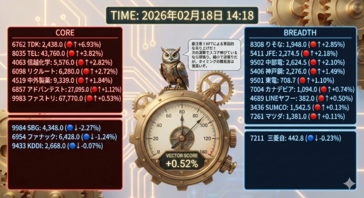Breadth側も平均+1%を超えており、実体経済株も追随していますが、Coreとの乖離 (+0.52%) が「要注意」の閾値を超えました。これはHFT(高頻度取引)が指数寄与度の高い銘柄をターゲットに、先物主導で相場を「作り」に行っている可能性を示唆します。
