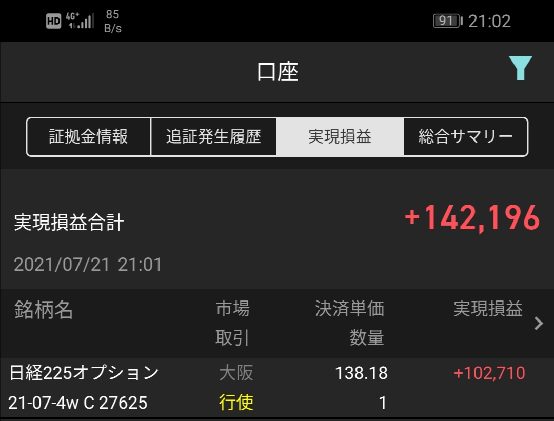 最終日に、ついでに買った宝くじ感覚の4w屑CALLは、ディープインとはいきませんが、買値の4倍程度の清算に・・最終日持ち越した屑OPがINすると儲け以上に非常に嬉しいのは筆者だけでございましょうか?転売や買戻しも良いですが・・権利行使ってのが良いのかな(笑)。