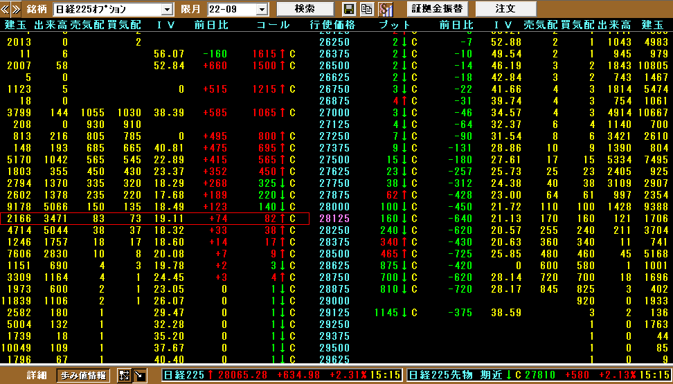 とは言え、三日目の日中取引の底値27300円付近~今日の28000円オーバーの値幅。