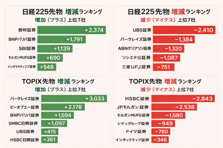 一方で、減少側のトップがUBSの“売り超拡大”。ABNも売りを増やしていて、HSBCもさらに売り側へ。つまり「売りが消えた」わけじゃなく、売りと買いの“席替え”が起きている。相場はこの手の席替えの最中に、いちばん人の確信をコメディに変えるのが得意です。結論としては、225は「上げたい力」と「押さえたい力」が同じフロアでにらみ合い中。次週、増減が連続する側(特に“売り超縮小”が続くか)が、主導権のヒントになります。