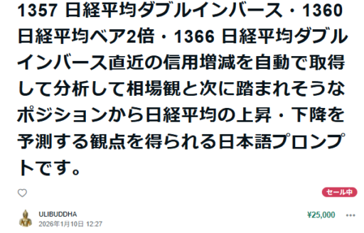 演算した時間に対し最新のデータ更新から直近3週の需給(信用残)を分析し日経平均推移を予測する為の一つの観点を提案するプロンプトです。質問に答えるのが大変なので当プロンプトをchatGPTplusで実際に演算させた出力結果を公開しておきます。需給についての知識の無い方や、信用残などの極端な偏りや増減が大人に狩られると言う観点を理解できていない方にはお勧め出来ませんので絶対に購入しないでください。個別に指導することはやっておりません。