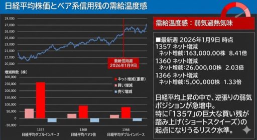 合計ネットの1週増減は -2,545,757 株で、弱気ポジションは全体としては後退寄り。ただし 1357 日経平均ダブルインバース はネット +341,244 株、1366 日経平均ダブルインバース はネット +183,888 株で、弱気の積み増しが残る。