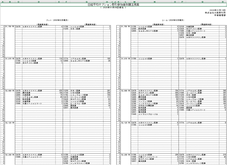 ABNクリアリン証券:CALL売り712 / PUT売り763 で両サイド売りが圧倒的。S0近辺 K=52000 に CALL売り704 / PUT売り635 が集中。弱点は大変動。